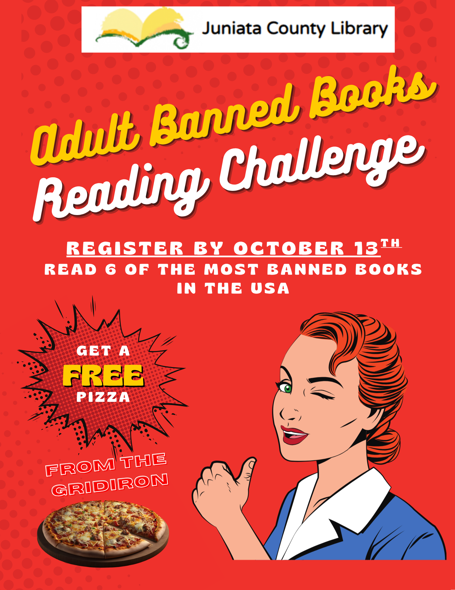Through a generous private donation, we are giving away one (1) gift card for a free large cheese pizza to anyone who reads 6 of the most-banned books at other libraries in the country. The gift cards will be for the Gridiron Pizza in Mifflintown PA.