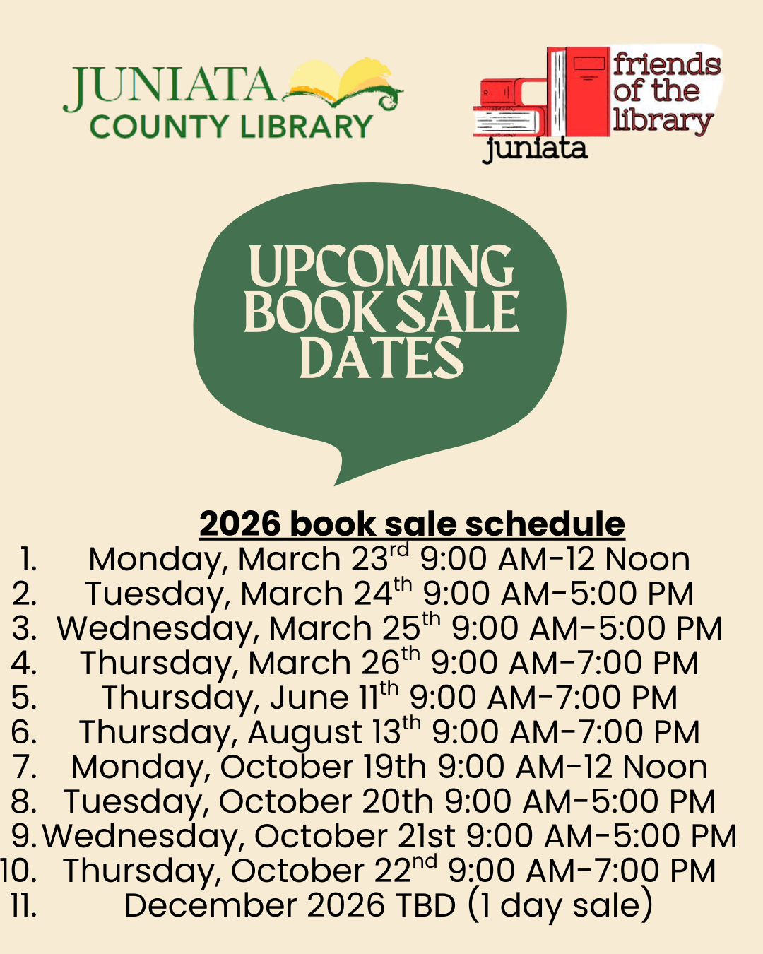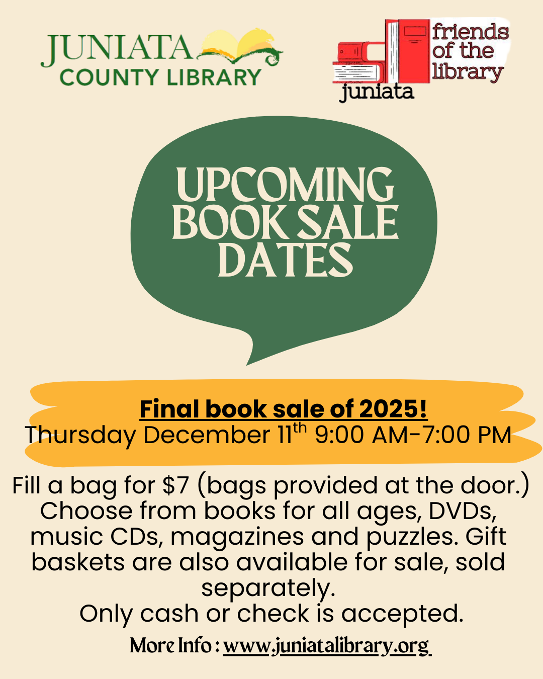 The Friends of the Library book and media sales occur 3-4 times a year. The Friends of the Juniata County Library appreciate the wonderful donations of books and media from the public. Donations may be brought to the front desk of the library during regular business hours. Your book/media donations are instrumental in funding many of the Juniata County Library's programs and services each year. These programs include but are not limited to summer reading for kids and adults, programs for babies and children, current technological devices, furniture, and much more.